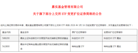 3月12日,嘉实基金将旗下3只ETF更名。其中,深交所挂牌的嘉实中证软件服务ETF将场内简称由“软件ETF”变更为“软件ETF嘉实”;上交所挂牌的ETF也更改了扩位证券简称,“科创芯片ETF、稀有金属ETF”分别改为“科创芯片 ETF嘉实、稀有金属ETF嘉实”。