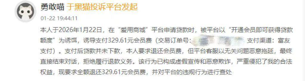 “本人于2026年1月22日,在‘爱用商城’平台申请贷款时,被平台以‘开通会员即可获得贷款额度’为诱饵,诱导支付329.61元会员费,支付渠道为富友支付。支付后贷款并未下款,本人要求退还会员费,但平台客服以无关问题恶意拖延,最终直接结束对话,拒绝履行退款义务。该行为已构成虚假宣传和恶意欺诈,严重侵犯了我的合法权益,现要求全额退还329.61元会员费,并对平台的违规行为进行查处。”有网友如是投诉道。