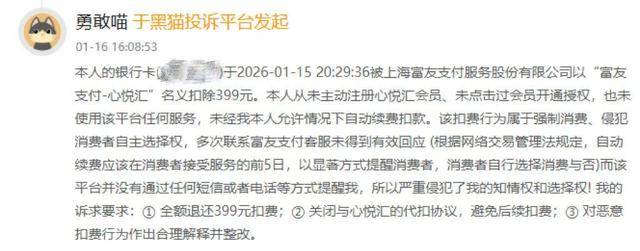 其中一位网友详细地阐述了他的经历:“本人的银行卡被上海富友支付服务股份有限公司以‘富友支付-心悦汇’名义扣除399元。本人从未主动注册心悦汇会员、未点击过会员开通授权,也未使用该平台任何服务,未经我本人允许情况下自动续费扣款。该扣费行为属于强制消费、侵犯消费者自主选择权,多次联系富友支付客服未得到有效回应(根据网络交易管理法规定,自动续费应该在消费者接受服务的前5日,以显著方式提醒消费者,消费者自行选择消费与否)而该平台并没有通过任何短信或者电话等方式提醒我,所以严重侵犯了我的知情权和选择权!我的诉求要求:全额退还399元扣费;关闭与心悦汇的代扣协议,避免后续扣费;对恶意扣费行为作出合理解释并整改。”