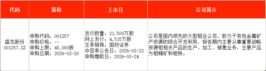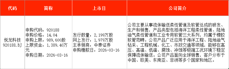 从时间表看,宏明电子(301682)、视涯科技(688781)、悦龙科技(920188)等在本周一(3月16日)申购;慧谷新材(301683)、泰金新能(688813)、盛龙股份(001257)等在本周五申购。