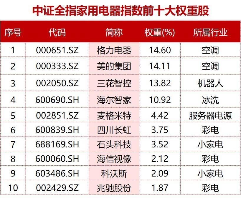 中证全指家用电器指数的成份股包括白电、黑电、厨电、小家电等4个品类,一键打包家电全品类核心资产,前十大成份股占比超70%。