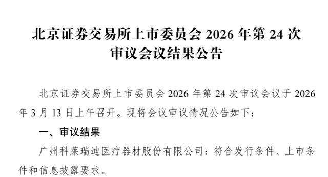 瑞财经 严明会 3月16日,据北京证券交易所上市委员会2026年第24次审议会议结果公告,广州科莱瑞迪医疗器材股份有限公司(以下简称:科莱瑞迪)符合发行条件、上市条件和信息披露要求。