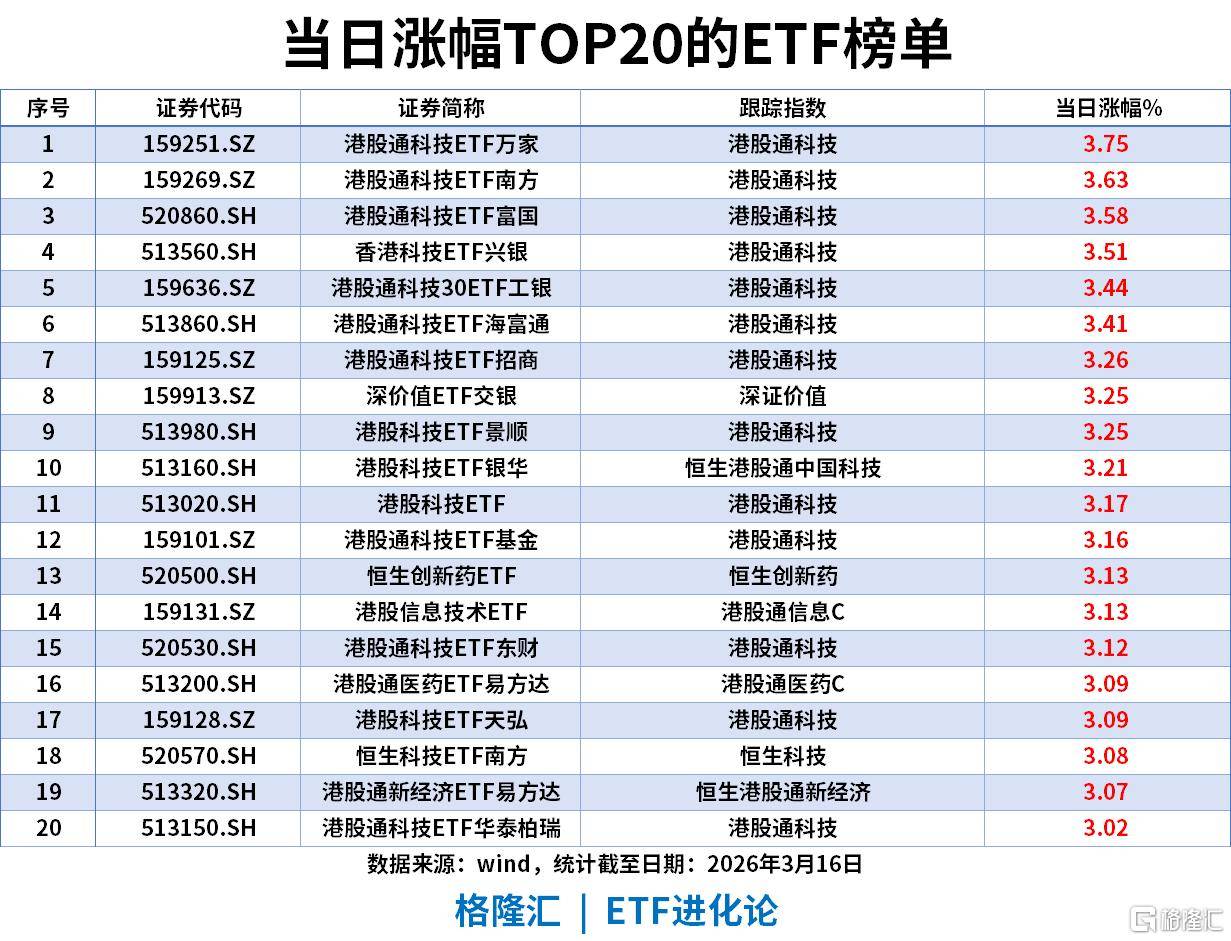 当日涨幅TOP20ETF(截至2026-03-16)