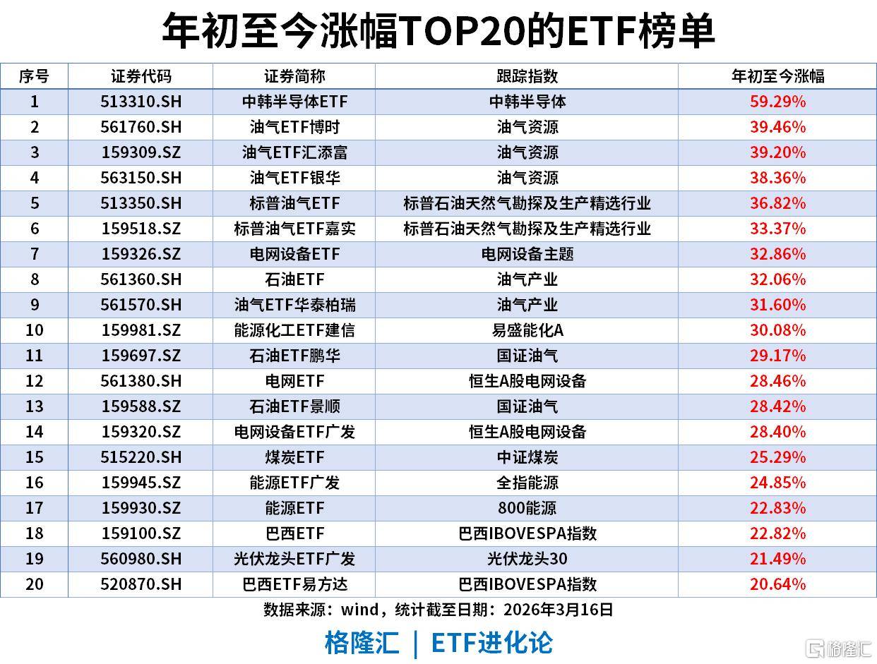 年初至今涨幅TOP20ETF(截至2026-03-16)