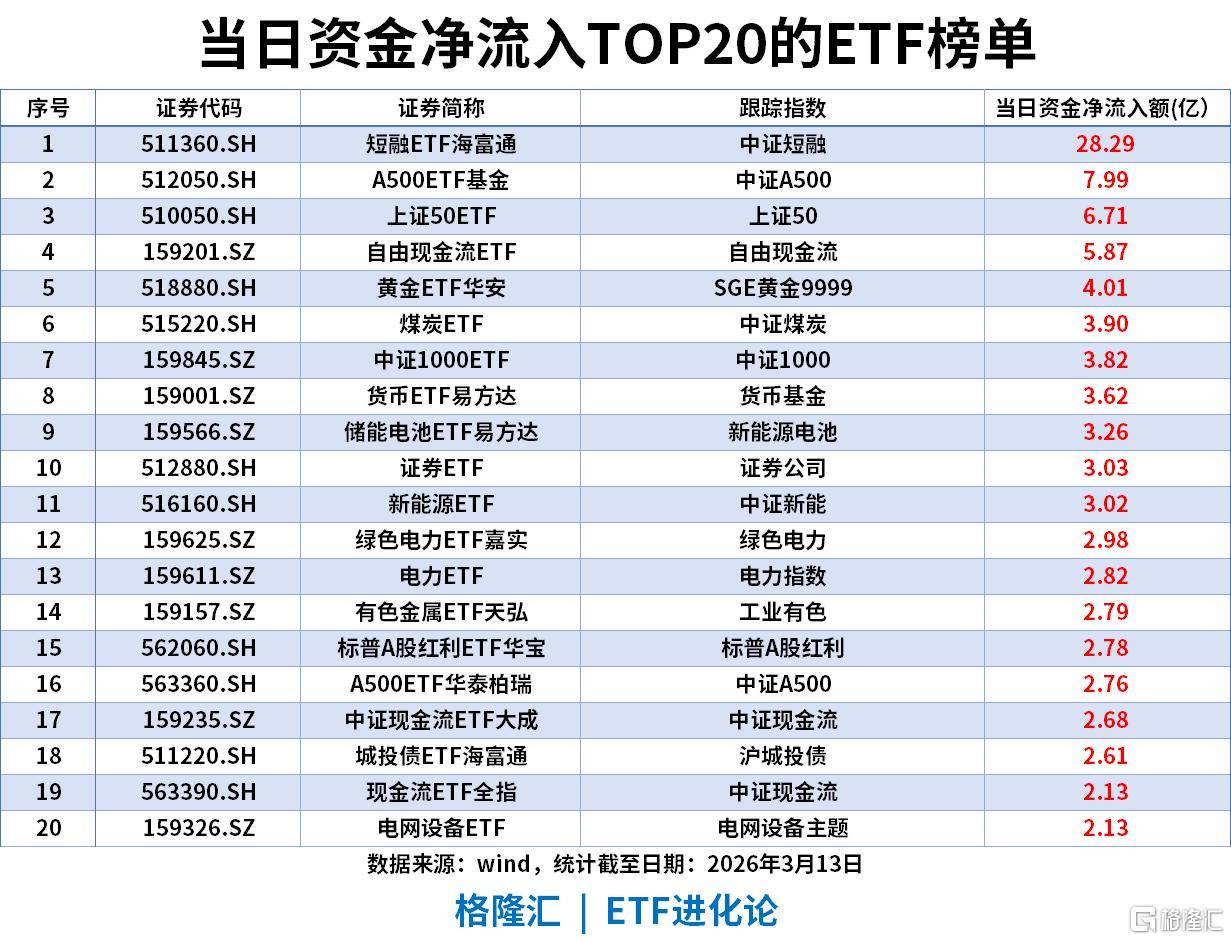 当日ETF资金净流入TOP20(截至2026-03-13)