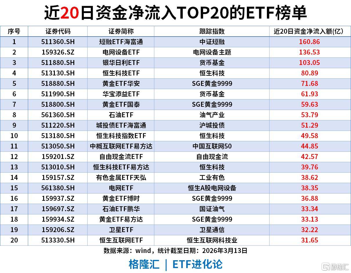 近20日ETF资金净流入TOP20(截至2026-03-13)