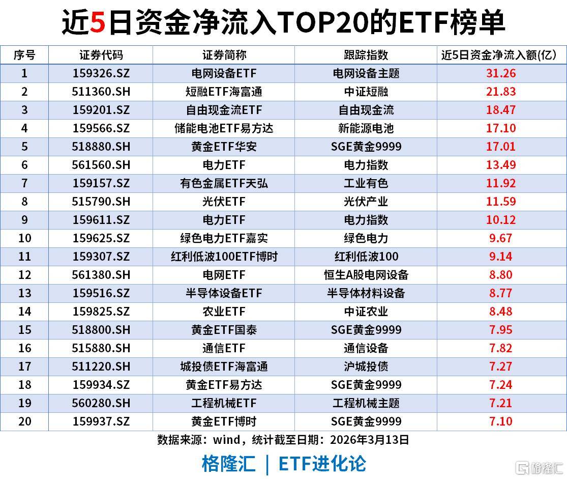 近5日ETF资金净流入TOP20(截至2026-03-13)