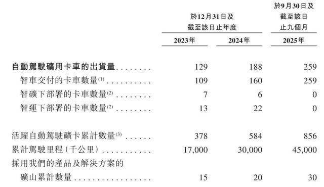 伯镭科技的自动驾驶矿用卡车的出货量主要是交付的卡车,各期内达到109辆、160辆及259辆。各期末,采用伯镭科技的产品及解决方案的矿山累计数量达到15座、20座、30座、