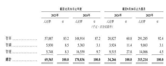 伯镭科技的收入的增长主要得益于核心业务智车的增长。2023年及2024年,公司智车业务收入分别为5788.7万元及1.49亿元,2025年前9个月为2.91亿元。