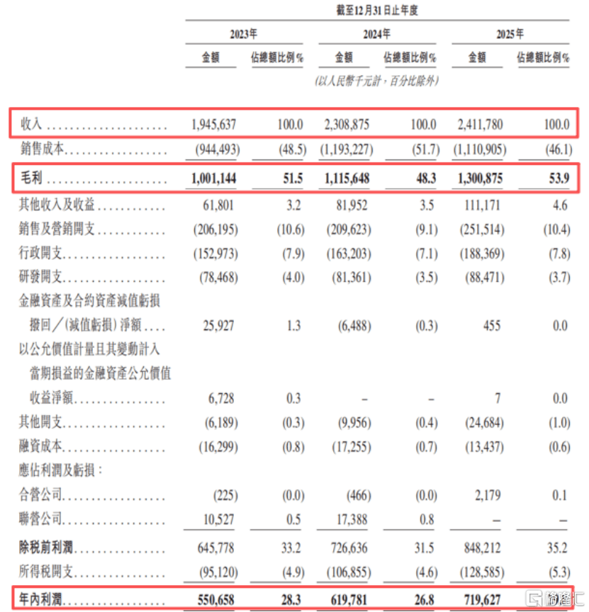2023年、2024年及2025年(报告期),公司的收入分别为19.46亿元、23.09亿元、24.12亿元,复合年增长率为11.3%,净利润分别为5.51亿元、6.2亿元、7.2亿元,毛利率分别为51.5%、48.3%及53.9%。