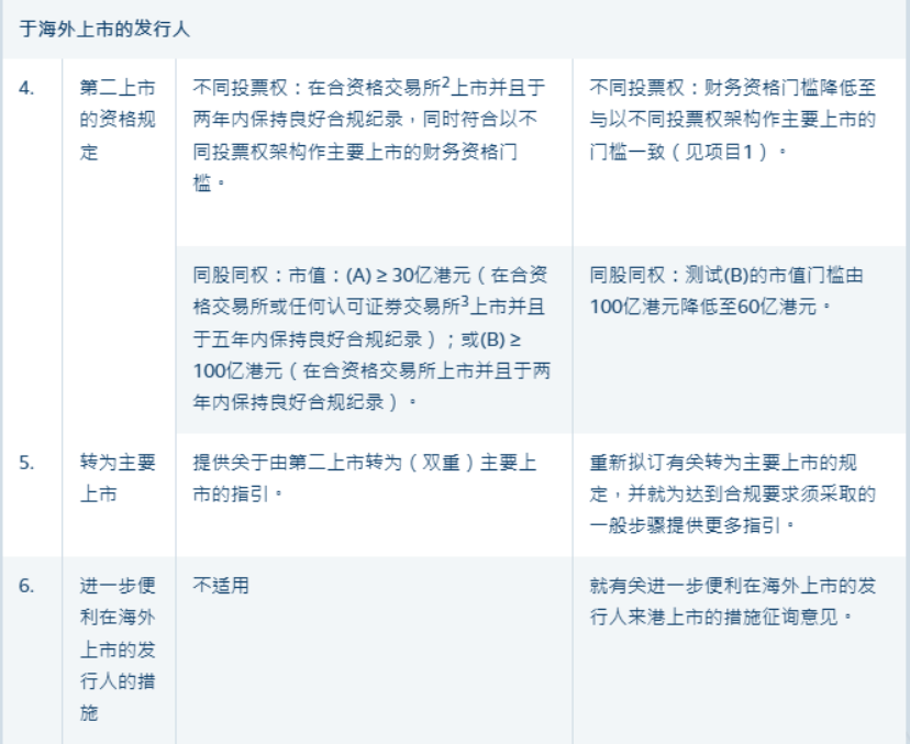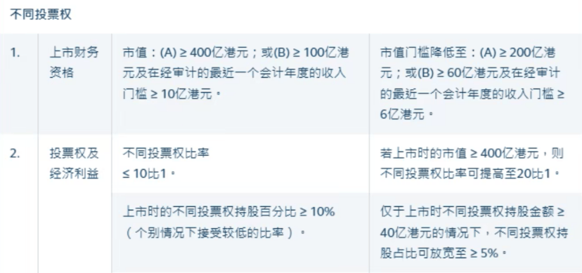 •不同投票权架构:财务门槛降至与主要上市新规一致(即60亿港元市值+6亿港元收入)。