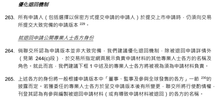 •代价:为了对冲保密递表可能带来的文件质量下降风险,联交所强化了“退回机制”。一旦申请材料被认定为“非大致完备”而被退回,联交所不仅会公布保荐人的身份,还将公布所有参与编制的专业机构(律师事务所、会计师事务所、行业顾问等)的名称及角色,以此形成强大的市场声誉约束,倒逼中介机构履职尽责。