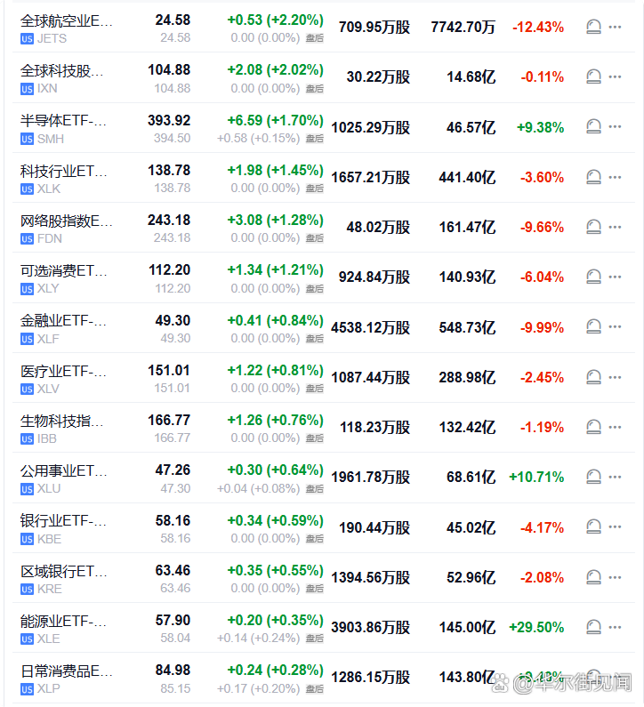 【航空业ETF收涨2.2%,领跑美股行业ETF】周一(3月16日),全球航空业ETF收涨2.20%,全球科技股指数ETF涨2.02%,半导体ETF、科技行业ETF、网络股指数ETF、可选消费ETF至少涨1.21%,能源业ETF涨0.35%表现倒数第二。