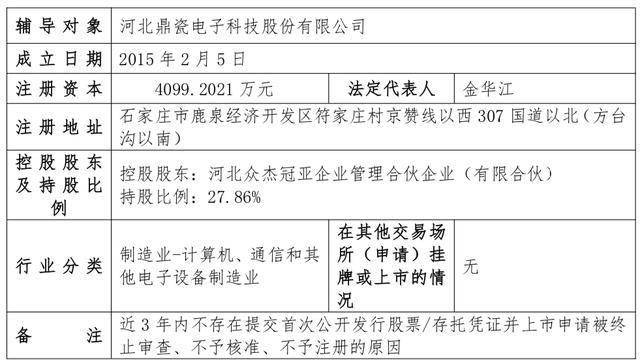 瑞财经 严明会 近日,河北鼎瓷电子科技股份有限公司(以下简称:鼎瓷科技)在河北证监局完成IPO辅导备案,辅导机构长江证券。