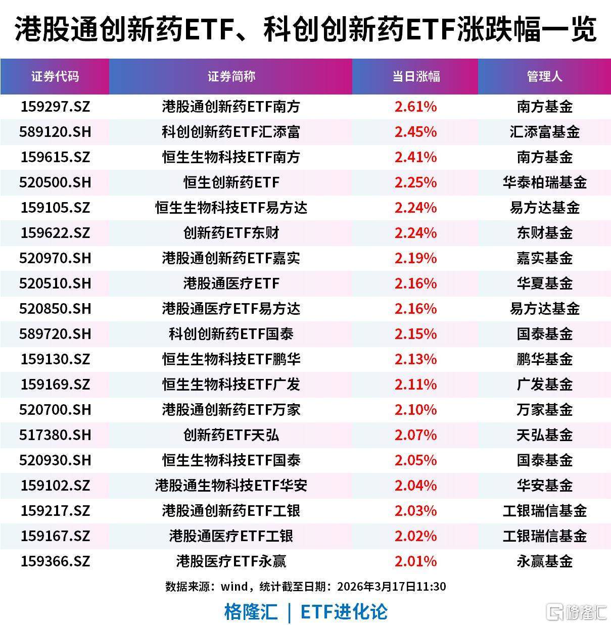 创新药板块上涨,港股通创新药ETF南方、科创创新药ETF汇添富、恒生生物科技ETF南方、恒生创新药ETF、恒生生物科技ETF易方达、创新药ETF东财、港股通创新药ETF嘉实、港股通医疗ETF、港股通医疗ETF易方达、科创创新药ETF国泰、恒生生物科技ETF鹏华、恒生生物科技ETF广发、港股通创新药ETF万家、创新药ETF天弘、恒生生物科技ETF国泰、港股通生物科技ETF华安、港股通创新药ETF工银、港股通医疗ETF工银、港股医疗ETF永赢涨超2%。