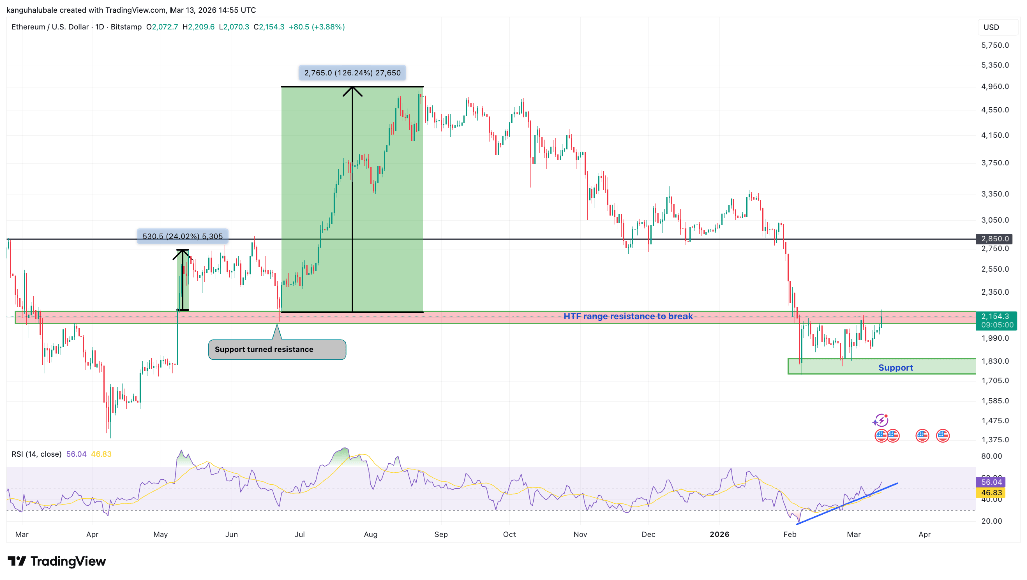 TradingView数据显示,ETH正在尝试突破近期抑制其价格的2100-2200美元阻力区。