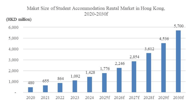 据MIGO报告显示,香港学生公寓租赁市场正经历快速扩张,预计市场总规模将从2020年的4.8亿港元(6150万美元)增长至2030年的57亿港元(7.314亿美元),复合年增长率接近24%。