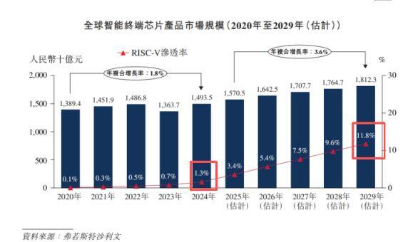 奕斯伟计算的IPO,本质上是一场“赌赛道”的博弈——赌RISC-V架构能在未来打破X86、ARM的垄断,赌自身能在行业爆发前站稳脚跟。从行业趋势来看,RISC-V的渗透率正在稳步提升,2024年在智能终端市场的渗透率为1.3%,预计2029年将增至11.8%;在具身智能市场的渗透率为6.4%,2029年有望达19.1%,若行业如期爆发,奕斯伟计算作为早期布局者,有望抢占先发优势。