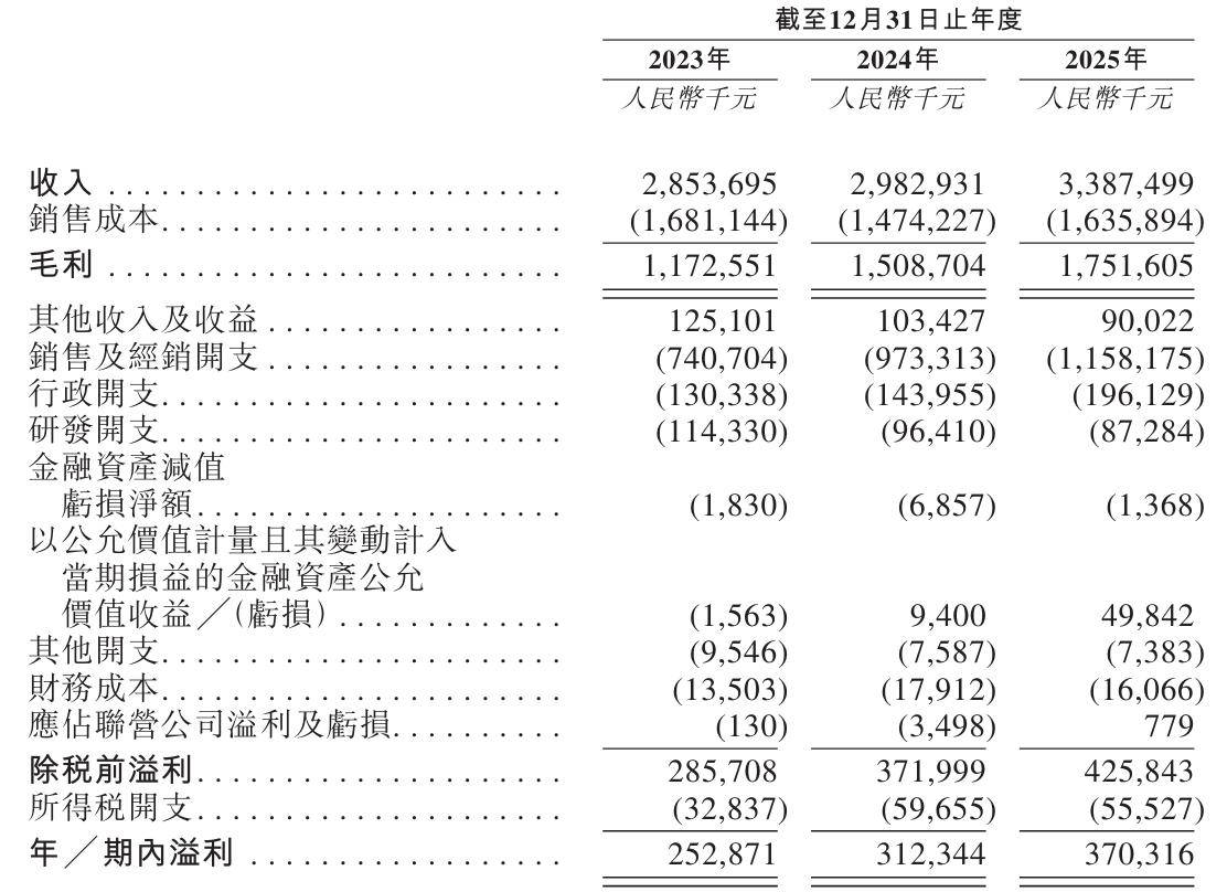 招股书显示,可孚医疗2023年、2024年、2025年营收分别为28.54亿元、29.83亿元、33.87亿元;毛利分别为11.73亿元、15亿元、17.52亿元;期内盈利分别为2.53亿元、3.12亿元、3.7亿元。