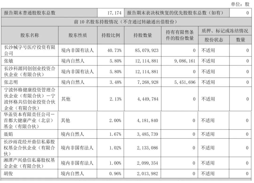 截至2025年9月30日,长沙械字号医疗投资有限公司持股为40.73%,张敏直接持股为5.8%,长沙科源同创创业投资合伙企业(有限合伙)持股为5.8%,张志明持股为3.48%,宁波怀格健康投资管理合伙企业(有限合伙)-宁波怀格共信创业投资合伙企业(有限合伙)持股2.13%;