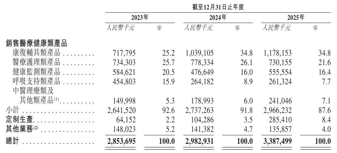 可孚医疗2025年来自康复辅具类产品收入为11.78亿元,占比为34.8%;来自医疗护理类产品收入为7.3亿元,占比为21.6%;来自健康监测类产品收入为5.56亿元,占比为16.4%;来自呼吸支持类产收入为2.61亿元,占比为7.7%;来自中医理疗类及其他类产收入为2.41亿元,占比为7.1%。