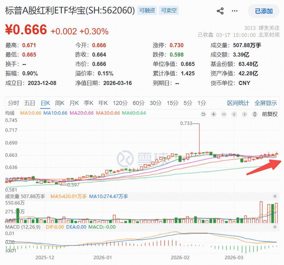 全市场唯一跟踪该指数的高人气热门标的——标普A股红利ETF华宝(562060)表现尤为亮眼,收涨0.3%低调斩获“九连阳”,收盘价报0.666元。交投持续火爆,当日成交额突破3.39亿元,近一周日均成交额超2.4亿元,流动性优势显著。