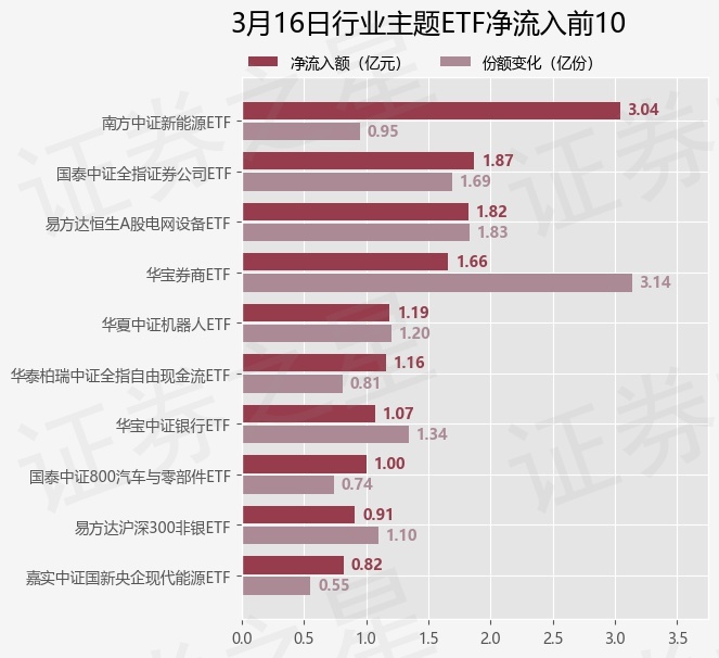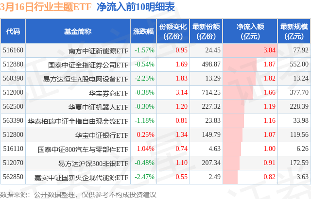 当日有130只行业主题ETF基金出现资金净流入,其中净流入排首位的是南方中证新能源ETF(516160),份额增加了9500.0万份,净流入额为3.04亿元。