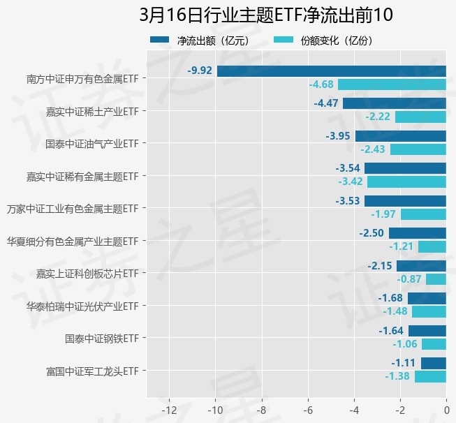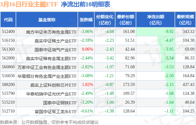 当日有119只行业主题ETF基金出现资金净流出,其中净流出排首位的是南方中证申万有色金属ETF(512400),份额减少了4.68亿份,净流出额为9.92亿元。