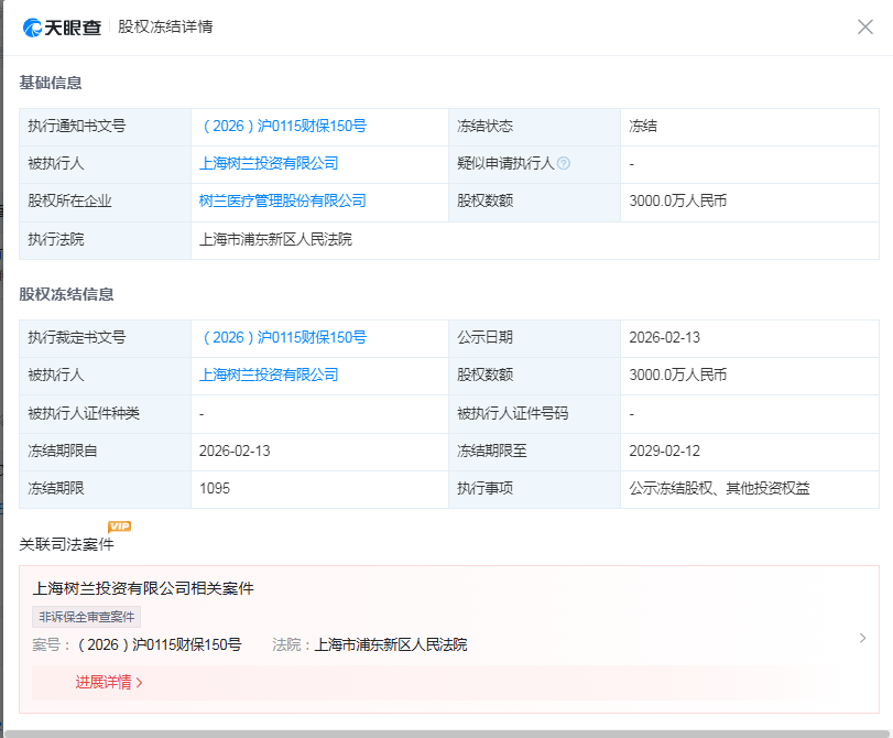 而近日,在IPO停滞期间,该公司又出现了引发市场关注的变动。天眼查信息显示,2026年2月13日,树兰医疗第一大股东上海树兰投资有限公司持有的3000万元股权被上海市浦东新区人民法院冻结,冻结原因尚未公开。
