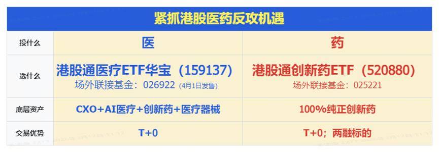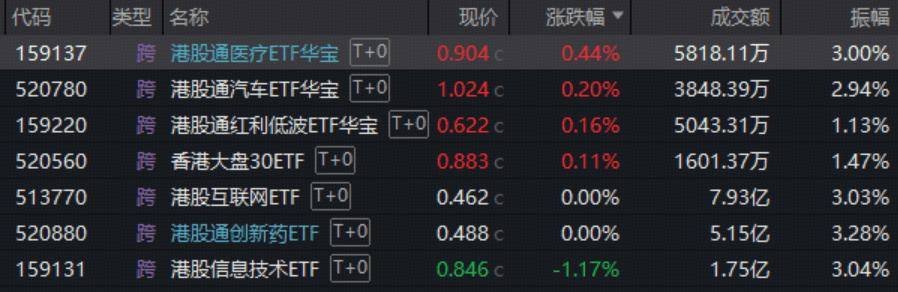 医药板块亦陷震荡,港股医疗核心资产——港股通医疗ETF华宝(159137)早盘一度摸高3.38%,最终小幅收涨0.44%,100%创新药研发——港股通创新药ETF(520880)放量收平。