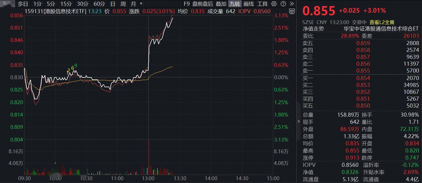 今日(3月16日)午后,港股集体拉升,代表港股硬科技的港股通信息C指数劲涨1.85%,兆易创新涨超11%,华虹半导体涨超6%,澜起科技、鸿腾精密涨逾5%。全市场唯一聚港股信息技术ETF(159131)早盘开盘后在水面附近宽幅震荡,午后突然直线拉升,现涨3.01%,有望终结三连阴。