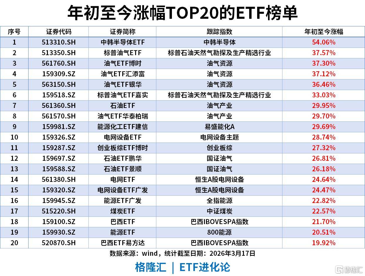年内涨幅榜,中韩半导体ETF(513310)涨幅高达54.06%。海外资产崛起:标普油气(37.57%)、巴西ETF(21.79%)悉数在列。