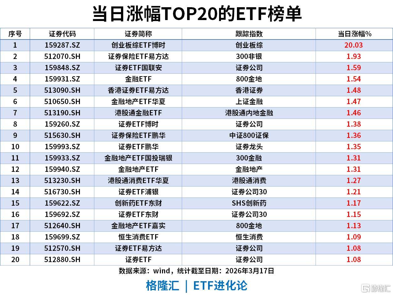 近5日涨幅TOP20的ETF榜单,创业板综ETF博时、能源化工ETF建信、港股通汽车ETF易方达、港股通汽车ETF富国、港股汽车ETF 、银行ETF天弘上榜。