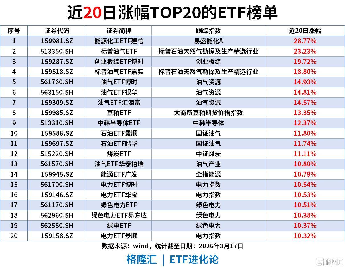 近20个交易日,市场的审美瞬间发生了从“弹性”到“硬核资产”的漂移。能源化工ETF(159981)以28.77%的涨幅居首,标普油气ETF(513350)则录得23.23%。