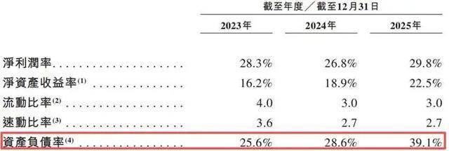 业务规模的扩大,对应的是负债率的提升。过去三年,该公司的资产负债率,分别为25.6%、28.6%、39.1%。在短期流动性方面,其流动比率从2023年的4.0降至2025年的3.0,速动比率从3.6降至2.7。