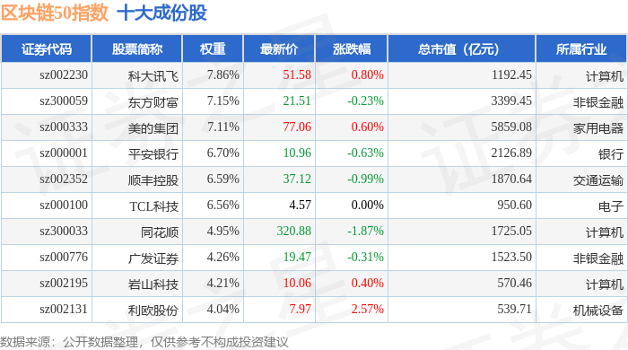 区块链50(399286)指数十大成份股详情如下: