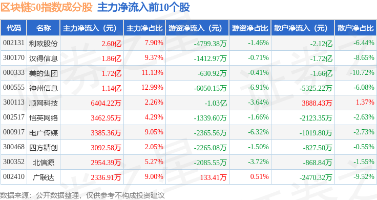 资金流向方面,区块链50(399286)指数成份股当日主力资金净流出合计2.47亿元,游资资金净流出合计1.24亿元,散户资金净流入合计3.7亿元。成份股资金流向详情见下表:
