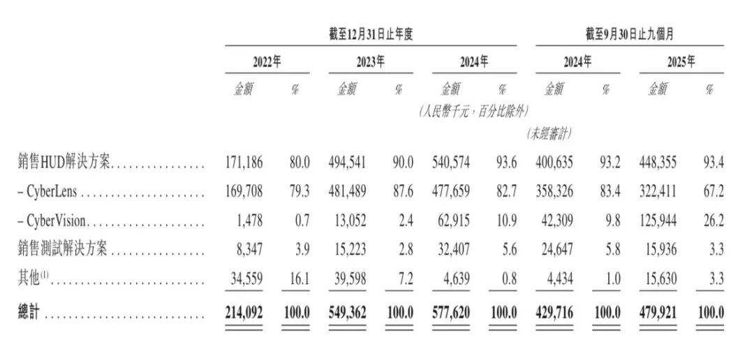 泽景股份的收入结构很简单,几乎全靠HUD产品。2025年前9个月HUD解决方案收入占总收入的93.4%。具体来说: