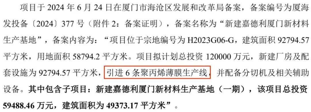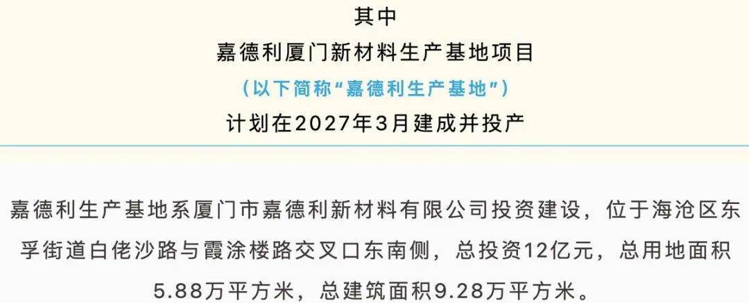 在第七号、八号生产线建设并投产的同时,嘉德利其他扩产项目也在同步展开。2024年9月7日,福建日报公众号发布了一篇报道《就在厦门海沧!11个项目集中开竣工!总投资超168亿元》,内容提及嘉德利厦门新材料生产基地项目总投资12亿元,分两期建设,共计购置安装7条生产线。