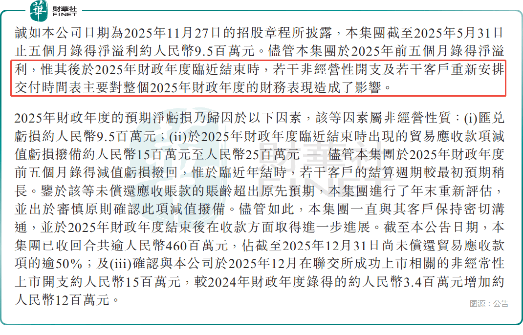 至于2025财年仍存在的亏损,主要来自三方面非经常性影响:一是汇兑亏损约950万元,二是年末基于审慎原则计提的1500万元至2500万元贸易应收款项减值拨备,且公司在财年结束后已收回超4.6亿元应收账款,占年末未偿还总额的50%以上,回款情况良好;三是上市相关非经常性开支约1500万元,较2024财年大幅增加。