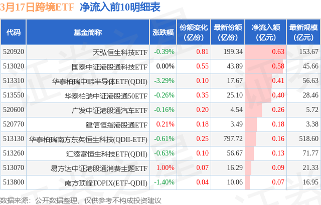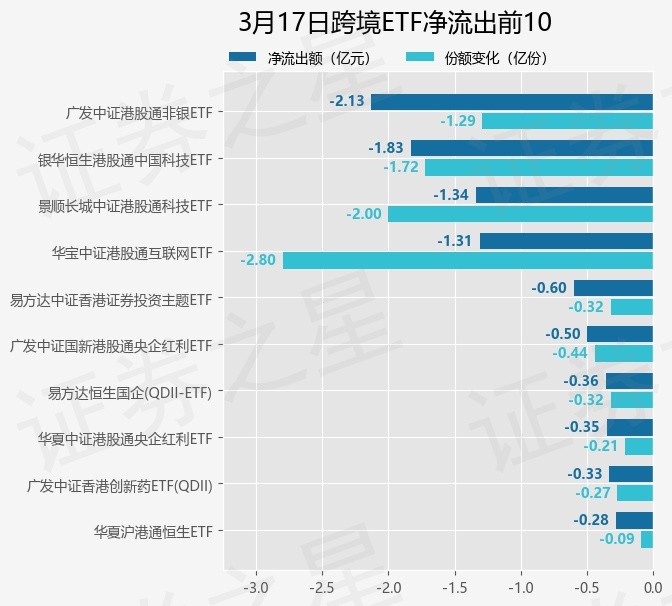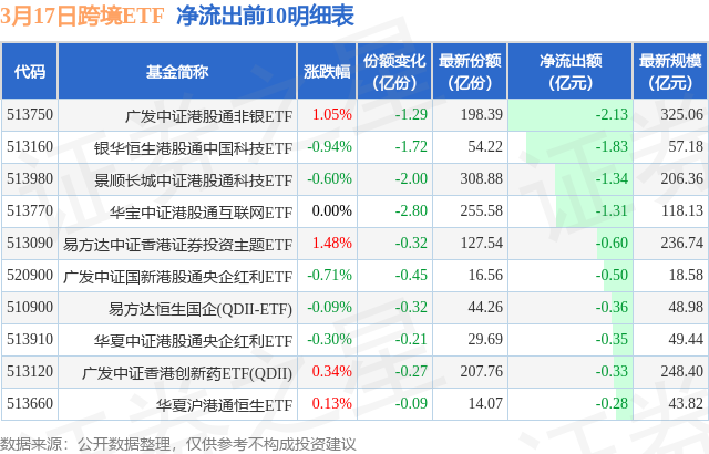 当日有43只跨境ETF基金出现资金净流出,其中净流出排首位的是广发中证港股通非银ETF(513750),份额减少了1.29亿份,净流出额为2.13亿元。