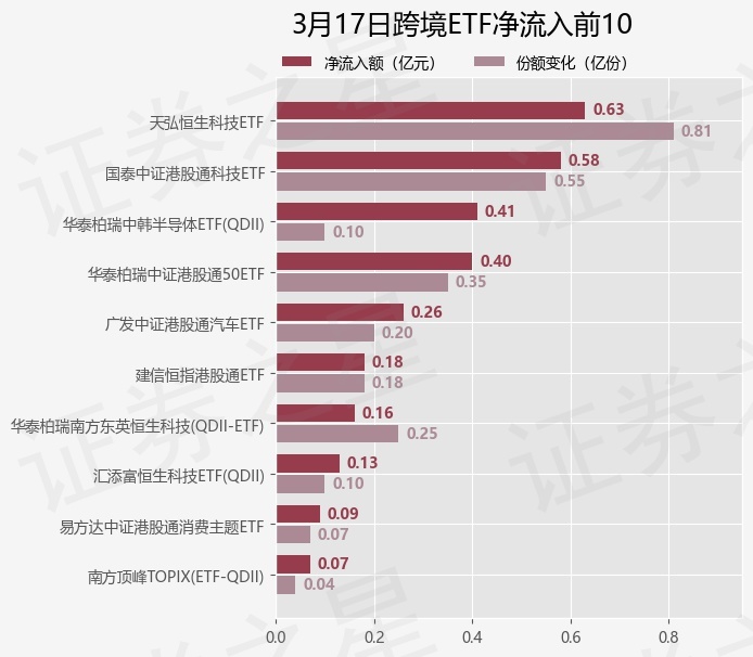 当日有35只跨境ETF基金出现资金净流入,其中净流入排首位的是天弘恒生科技ETF(520920),份额增加了8100.0万份,净流入额为6335.47万元。