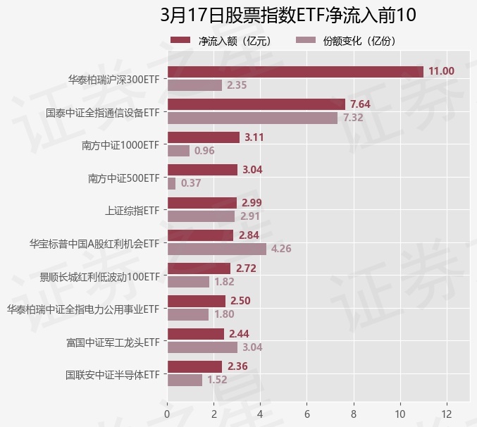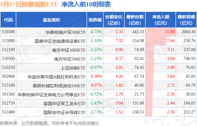 当日有243只股票指数ETF基金出现资金净流入,其中净流入排首位的是华泰柏瑞沪深300ETF(510300),份额增加了2.35亿份,净流入额为11.0亿元。