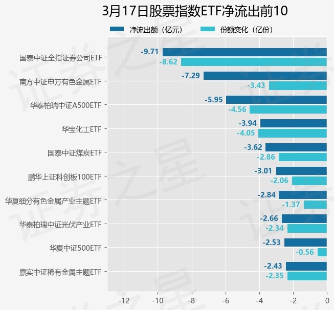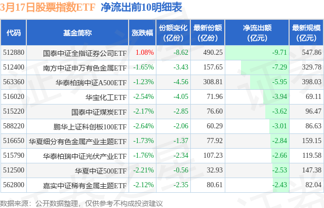 当日有220只股票指数ETF基金出现资金净流出,其中净流出排首位的是国泰中证全指证券公司ETF(512880),份额减少了8.62亿份,净流出额为9.71亿元。