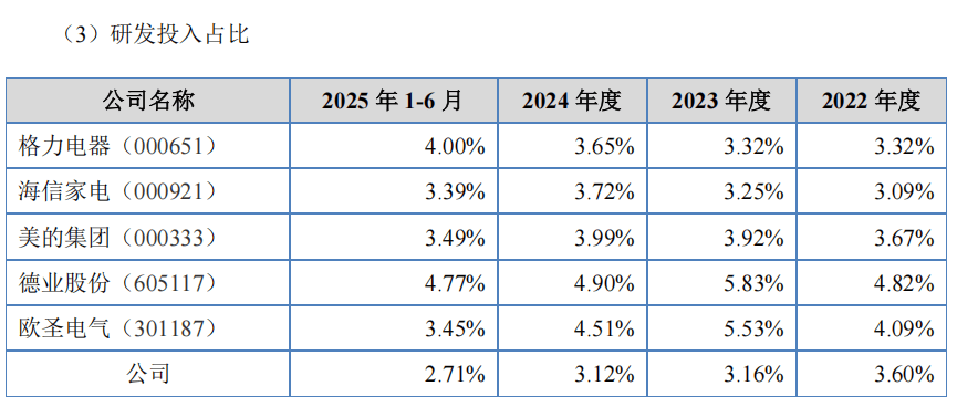 招股书显示,报告期内,欧伦电气的研发费用分别为3500.28万元、3888.00万元、5065.71万元和3367.70万元,占当期营业收入的比例分别为3.60%、3.16%、3.12%和2.71%。而且,欧伦电气的研发费用率明显低于绝大部分同行可比公司的研发费用率。