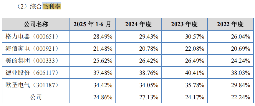 然而,根据欧伦电气在招股书中披露,报告期内,该公司的毛利率分别为22.24%、24.17%、27.13%和24.86%,同行可比公司德业股份的毛利率分别为38.03%、40.41%、38.76%和37.48%。
