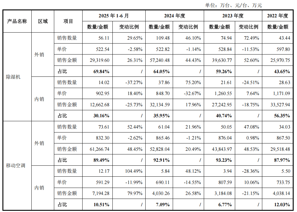 下降 25.73%,与德业股份整体销售变动趋势一致,符合行业特征和天气情况。但鉴于公司外销规模占比较高,而境外表现良好,因此2025年 1-6月除湿机销售额仍保持4.27%的增长。