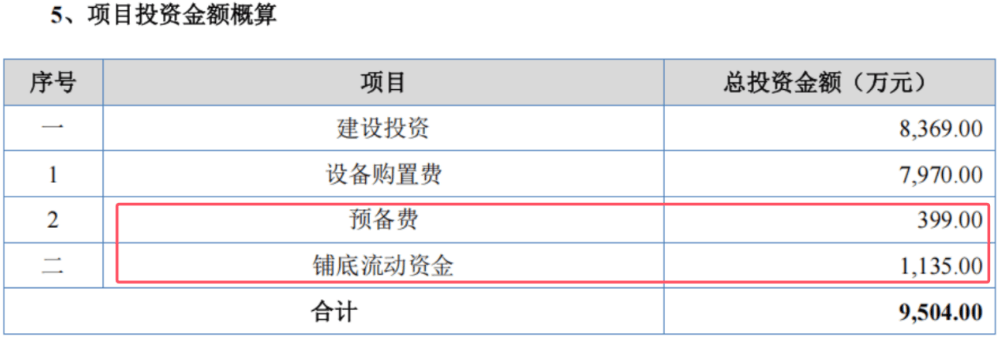 上述0.95亿元的募投资金中有399万元用于预备费,1135万元用于铺底流动资金,二者合计1534万元。