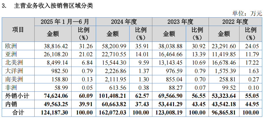 报告期内,欧伦电气来自欧洲的销售收入占比分别为24.05%、30.92%、35.91%和31.26%,同期来自亚洲的销售收入占比分别为11.79%、13.39%、14.01%和21.02%,来自北美洲的销售收入占比分别为17.22%、10.69%、9.59%和6.84%,来自大洋洲的销售收入占比分别为1.63%、0.79%、1.37%和0.79%,来自南美洲的销售收入占比分别为0.27%、0.70%、1.30%和0.13%。