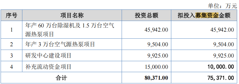 招股书显示,此次IPO,欧伦电气计划募集资金7.54亿元,其中4.59亿元用于年产60万台除湿机及1.5万台空气源热泵项目,0.95亿元用于年产3万台空气源热泵项目。